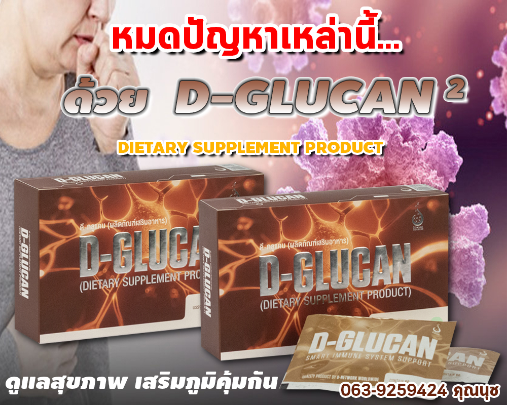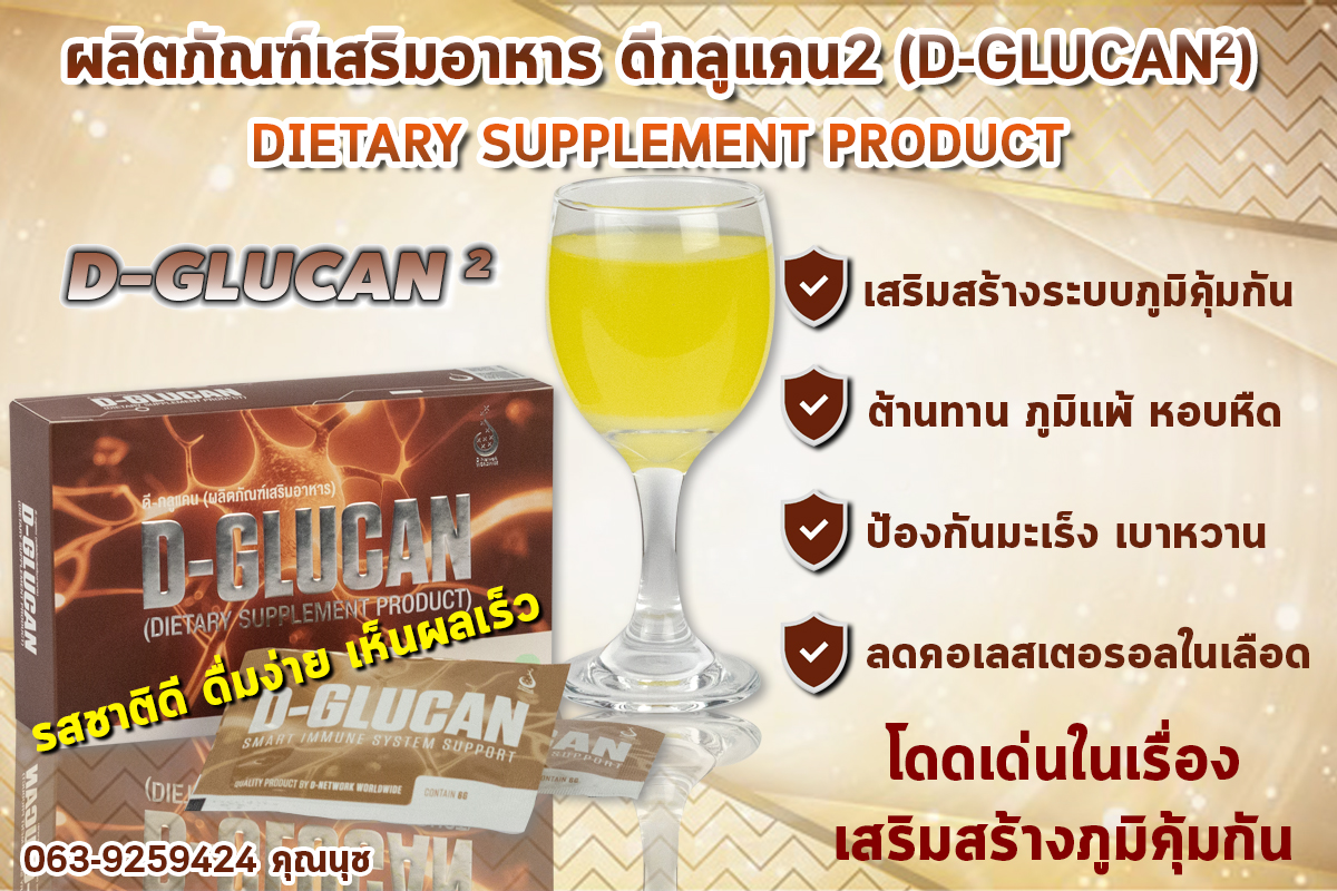 ดีกลูแคน2 D-Glucan2 เป็นผลิตภัณฑ์ที่ดีมากอีกตัวหนึ่ง แนะนำให้ใช้ในการดูแลสุขภาพสำหรับผู้รักสุขภาพทั่วไปและผู้มีปัญหาสุขภาพที่ต้องทานยาต่อเนื่องยาวนาน เนื่องจากเป็นการผสานกันอย่างลงตัวของสุดยอดสารอาหารที่เป็นที่ยอมรับในจุดเด่นของแต่ละตัวในยุคปัจจุบัน คือเบต้ากลูแคนและเอ็นไซม์ ดูแลร่างกายด้วยสารสกัดทรงประสิทธิภาพ ดีกลูแคนเป็นเบต้ากลูแคน ที่เสริมสร้างระบบคุ้มกัน มะเร็ง เบาหวาน ความดัน และลดระดับคอเรสเตอรอลในเลือด มีผลงานวิจัยกว่า 1,000 ครั้ง จัดทำโดยมหาวิทยาลัยในประเทศสหรัฐอเมริกา เช่น Harvard เพื่อพิสูจน์ถึงประสิทธิภาพของเบต้ากลูแคนและพบว่าเบต้ากลูแคน สามารถเสริมสร้างระบบภูมิคุ้มกันในร่างกายได้อย่างมีประสิทธิภาพ