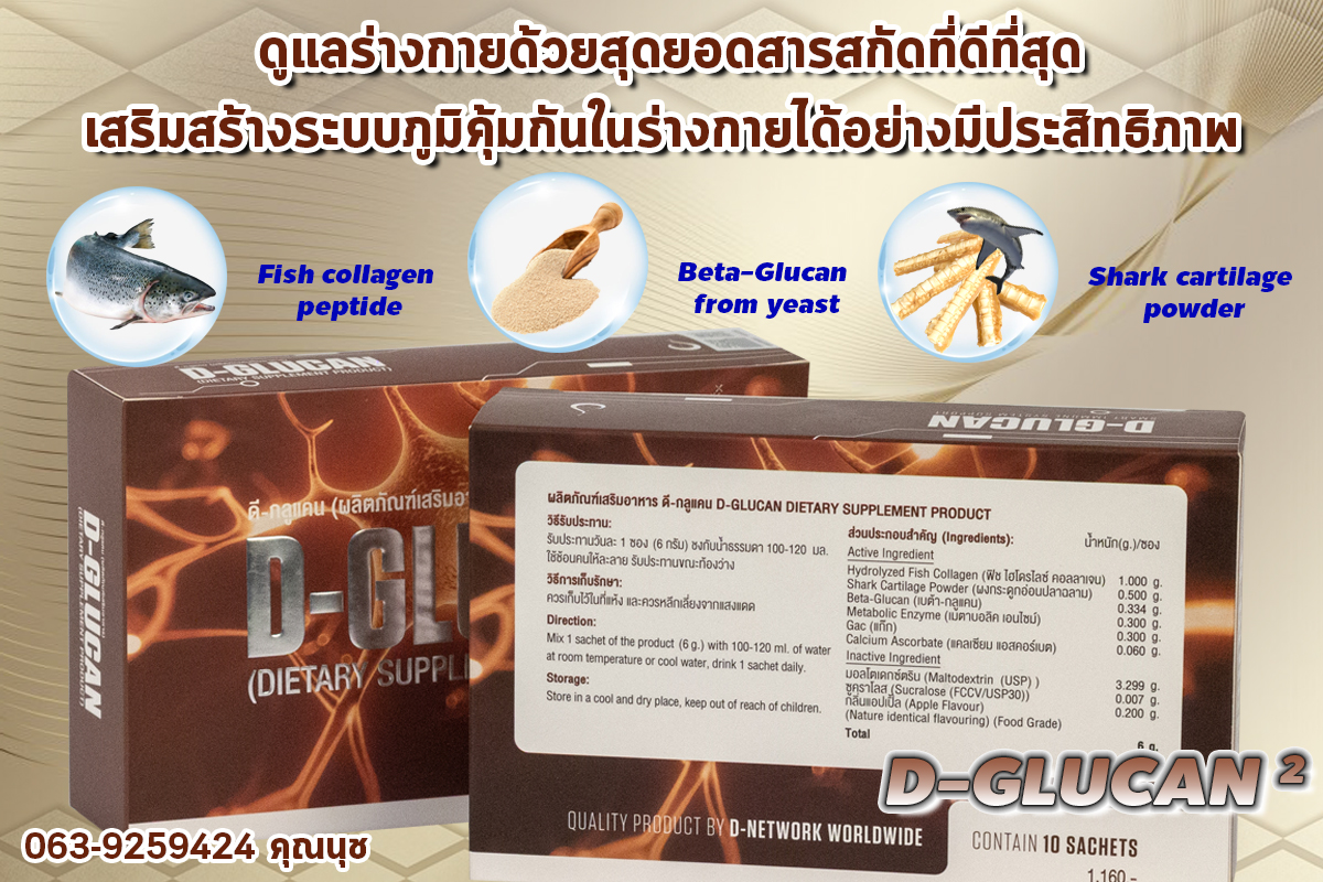 ดีกลูแคน2 D-Glucan2 โดดเด่นในเรื่องเสริมสร้างภูมิคุ้มกัน คือ เบต้ากลูแคน และเอนไซม์เข้าด้วยกันเป็นผลิตภัณฑ์เสริมอาหารชนิดผง ชงดื่ม รสชาติดี ดื่มง่าย เห็นผลเร็ว เสริมสร้างภูมิต้านทาน ดูแลร่างกายด้วยสุดยอดสารสกัดที่ดีที่สุดที่มนุษย์เคยค้นพบ ทางเลือกของผู้ที่มีปัญหา ป้องกันเบาหวาน มะเร็ง ภูมิแพ้ หอบหืด รูมาตอย ความดัน และโรคเสื่อมต่างๆ ดีกลูแคน2 D-Glucan2 เป็นการผสานสุดยอดสารอาหารระดับโลก